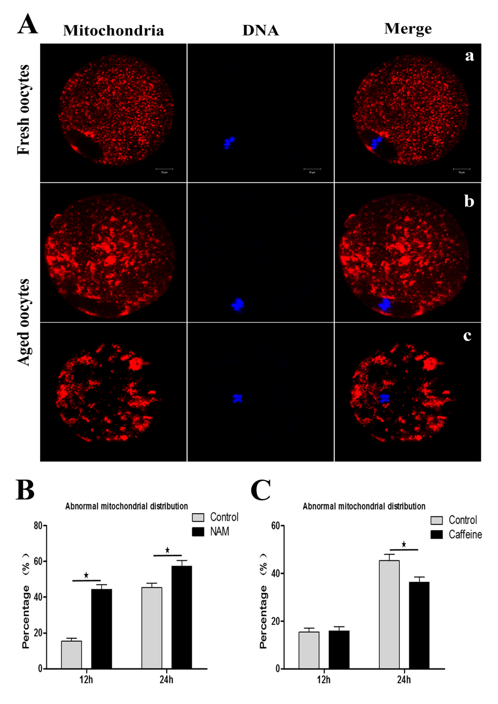 Mitochondria are also considered to be an important subcellular target of aging-related susceptibility to injury. We next examined whether inhibition of SIRT1, 2, 3 affect mitochondrial distribution during MII oocyte aging. As shown in Figure. 4A, mitochondria displayed a polarized distribution pattern in fresh MII oocytes. In contrast, the distribution of heterogeneous mitochondria in large clusters increased in aged MII oocytes compared to control MII oocytes. At 12 h or 24h of oocyte aging, the proportion of the abnormal distribution pattern was significantly increased in the NAM-treated group when compared with the control group, respectively (44.41 ± 4.66 vs. 15.45 ± 2.91%, P < 0.05; 57.31 ± 5.74 vs. 45.38 ± 4.51%, P < 0.05) (Figure 4B). These results suggested that SIRT1, 2, 3 may play an important role in protecting the structural and functional integrity of the post-ovulatory oocyte.