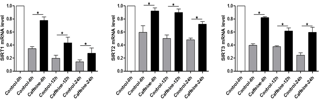 Caffeine, as an antioxidant compound, can inhibit hydrogen peroxide (H2O2)-generation[34]. Previous studies demonstrated that caffeine can delay oocyte aging by reducing p34cdc2 phosphorylation and increasing MPF activity[35]. To explore the potential correlation of caffeine and SIRT1, 2, 3 during the oocyte aging process, caffeine-treated oocytes and control-untreated oocytes were collected to analyze SIRT1, 2, 3 mRNA expression. When MII oocytes were exposed to 10 mM caffeine, the SIRT1, 2, 3 mRNA levels observed at 6 h, 12 h or 24h was significantly higher than that in control untreated oocytes, indicative of the delay of SIRT1, 2, 3 level decline (Figure. 5). Next, we performed caffeine treatment to test whether delaying the SIRT1, 2, 3 decline in aged oocytes could rescue phenotypes of aging. MII oocytes were exposed to caffeine for 12h or 24 h, and then immunolabeled to analyze their spindles and mitochondria. As shown in Figure 3C, oocyte analysis at 12 h or 24h showed that the proportion of aberrant spindles was significantly reduced in the caffeine group compared to the control group (16.46 ± 2.87 vs. 25.10 ± 1.26%, P < 0.05; 35.67 ± 2.74 vs. 46.47 ± 2.34%, P < 0.05). Moreover, these mitochondria-defective phenotypes at 24h were clearly decreased in caffeine-treated oocytes compared to control untreated oocytes (36.34 ± 3.63 vs. 45.38 ± 4.51%, P < 0.05; Figure. 4C). The results suggest that the caffeine-induced delay of SIRT1, 2, 3 decline may prevent postovulatory oocyte aging in vitro.