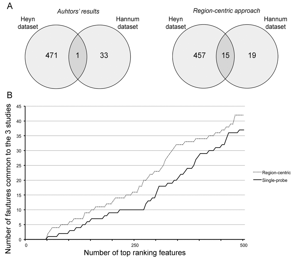 (A) Intersection between the results provided by Hannum et al. and Heyn et al. (left panel) and between the results of the region-centric approach on the two datasets. (B) Intersection between a progressively increasing number of top ranking features (BOPs for the region-centric analysis, CpG probes for the single-probe analysis) in the three datasets.