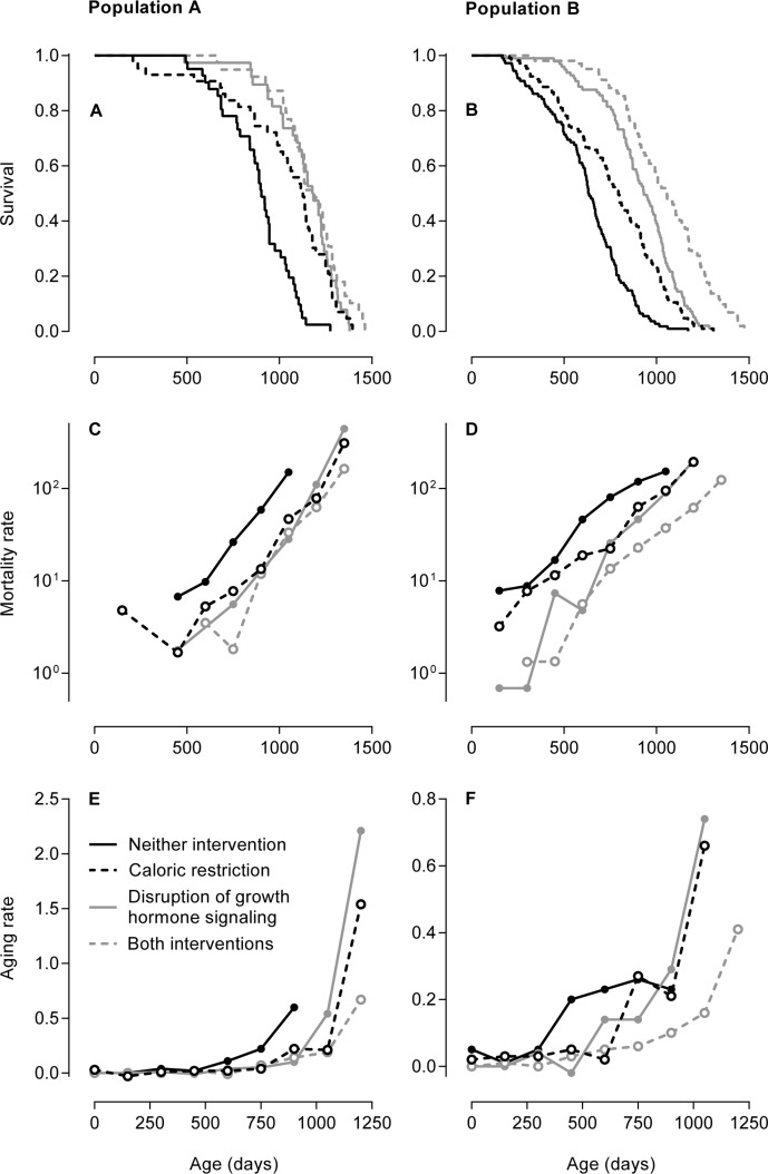Figures 1A and 1B show the age-dependent survival of the groups of mice in both study populations. These two figures have been published previously [19, 20] and are given here as references. In Population A, the mice subjected to caloric restriction, disruption of growth hormone signaling, or both survived longer than the mice not subjected to these interventions. In Population B, the mice subjected to both caloric restriction and disruption of growth hormone signaling survived longest, the mice subjected to either of these interventions had intermediate survival, and the mice not subjected to these interventions survived shortest. Aging rates cannot be discerned from these figures.