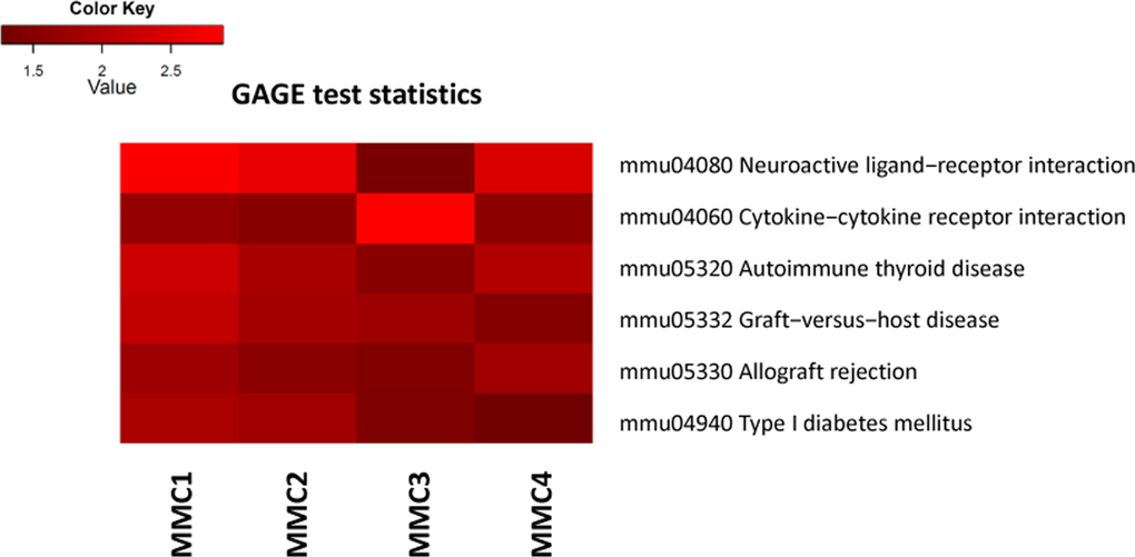 Additionally, we used a Generally Applicable Gene-set Enrichment (GAGE) analysis implemented as Bioconductor package (version 2.18.0) to detect significantly perturbed metabolic and signaling canonical pathways [17]. Bi-directional analysis yielded several significantly altered pathways, such as neuroactive ligand-receptor interaction, graft-versus-host disease, allograft rejection and others (Figure 2, Figure S. 3).