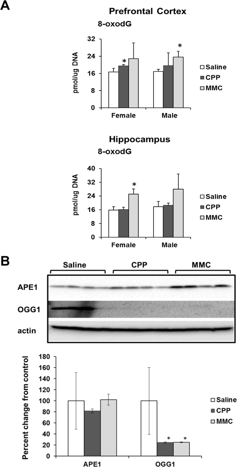 We explored potential mechanisms for the persistence of 8-oxodG in the genomic DNA of the PFC tissues of the MMC-exposed animals by determining the level of key base excision repair proteins involved in the repair of oxidative DNA damage. The level of base excision repair proteins is another well-accepted marker of oxidative DNA damage [22, 23]. Our analysis of the levels of 8-oxoguanine glycosylase (OGG 1) and apurinic/apyrimidinic endonuclease 1 (APE1) using Western immunoblotting revealed a statistically significant reduction in the levels of OGG1 (p=0.045 and p=0.044) in the PFC tissues of the MMC- and CPP-exposed female animals, respectively (Figure 3B). No statistically significant changes were observed in the levels of APE1 (Figure 3B).