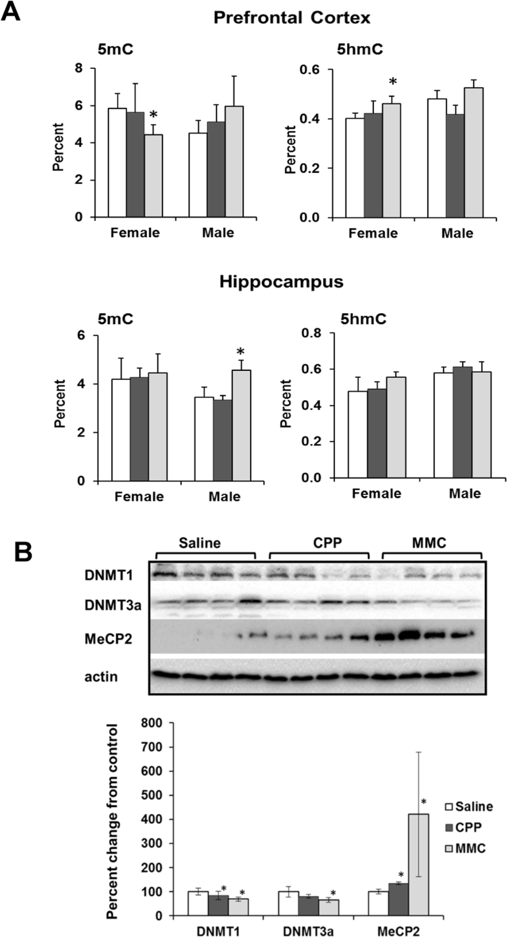 Several studies have indicated that aberrant cytosine DNA methylation may occur because of oxidative DNA damage [22, 24]. Aberrant DNA methylation is also associated with altered gene expression patterns [25]. Therefore, we analyzed the status of global DNA methylation in the hippocampal and PFC tissues of CPP- and MMC-exposed male and female mice. We determined the levels of 5-methyl-cytosine (5mC) and 5-hydroxymethyl-cytosine (5-hmC) in the genomic DNA of PFC and hippocampal tissues of chemotherapy-treated animals at 3 weeks post-exposure.