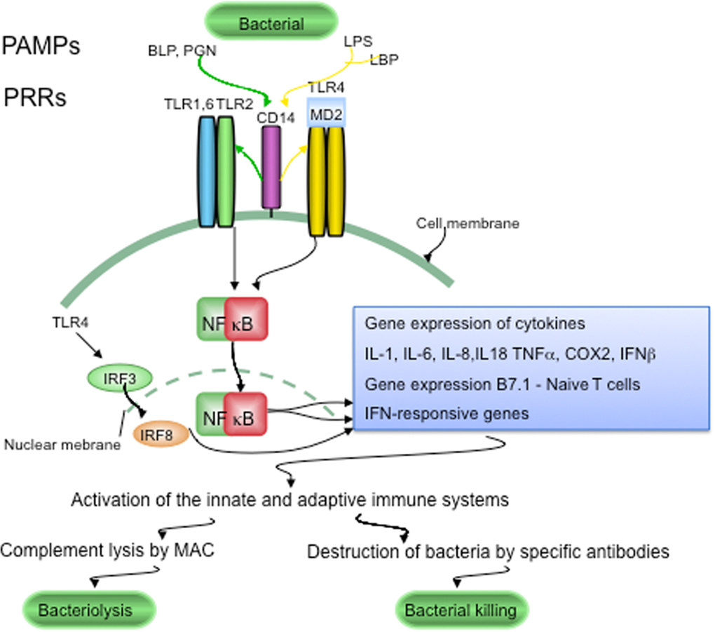 Whole bacteria and specific microbial components (LPS, BPG) are demonstrated in islet lesions in type 2 diabetes [27, 118, 165]. Such conserved microbial motifs (LPS, BPG, various bacterial lipoproteins, bacterial DNA etc.) are called pathogen-associated molecular patterns (PAMPs). PAMPs are sensed by pattern recognition receptors (PRRs) [166], which trigger an immediate response against invading pathogens. The major forms of PRRs are Toll-like receptors (TLRs) and some nucleotide-binding oligomerization domain (NOD) receptors called Nodlike receptors (NLRs) [167]. Once TLRs and NLRs are activated by PAMPs through signaling pathways, they induce innate and adaptive immune responses [167, 168]. Thus signaling by TLRs and NLRs is a key component of immune responses to microbial infection [169].