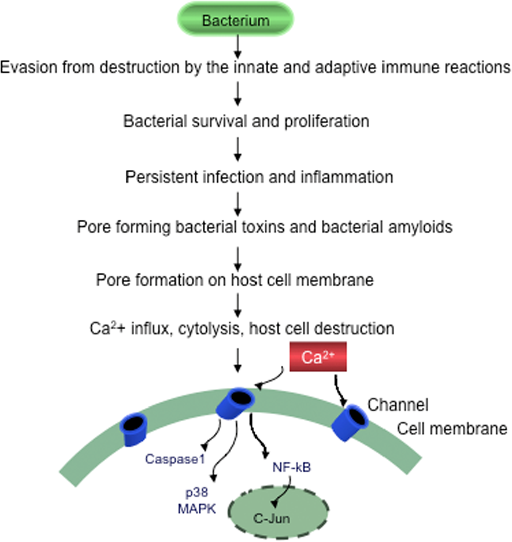 It has been hypothesized that amyloid pores may in fact be beta-sheet barrels similar to pore forming bacterial toxins [178]. Pore-forming toxins are the most common class of bacterial protein toxins and are often important virulence factors. These toxins are typically oligomers of soluble, monomeric proteins or peptides, which form transmembrane channels. Channel formation in the membrane of targeted cells triggering cellular ion imbalance is a frequent form of bacterial attack [179, 180]. These pore-forming bacterial toxins generate calcium-dependent and lipid-mediated signaling on host cell surfaces, leading to a variety of events such as tyrosine phosphorylation [181], actin rearrangement [182], NF-κB activation [183] and regulation of gene expression through histone modification [184].