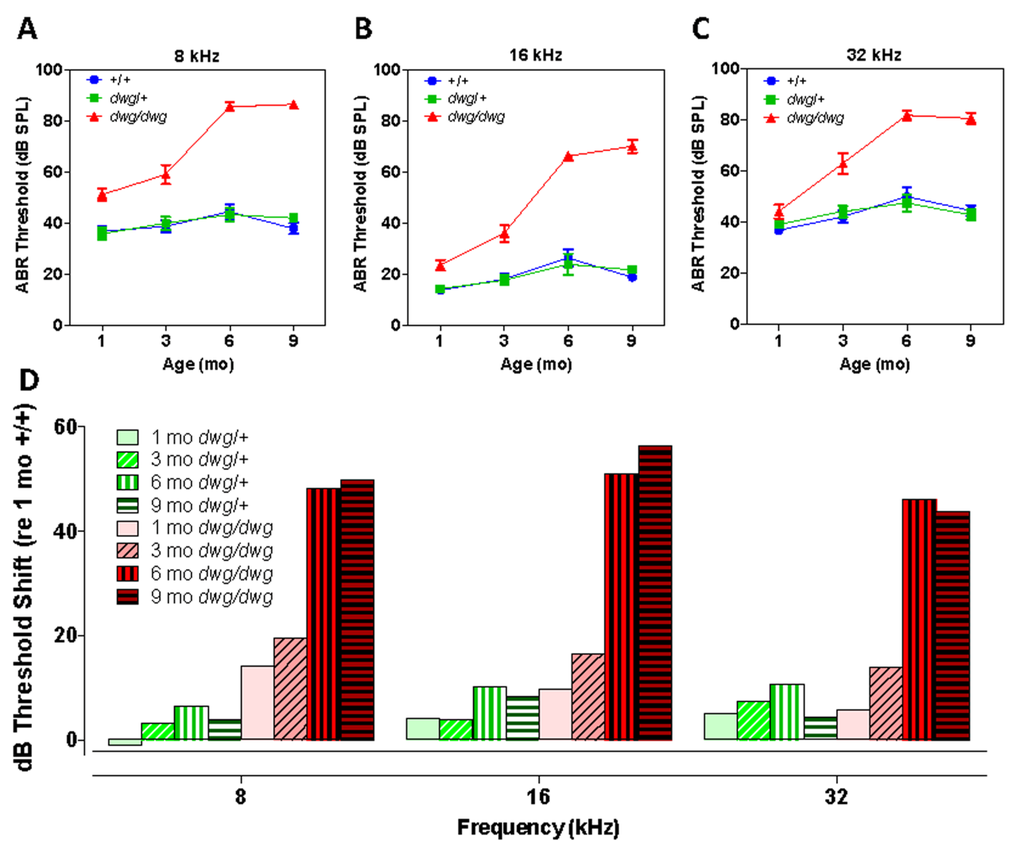 To determine if mice heterozygous or homozygous for the dwg mutation would develop ARHL at an accelerated rate compared to +/+ mice, ABR thresholds were measured at 1, 3, 6 and 9 months of age at 8, 16 and 32 kHz (Fig. 1A-C). At 8 and 16 kHz ABR thresholds in the +/+ and dwg/+ groups showed a slight to modest increase between 1 and 9 months of age (Fig. 1A-B). In contrast, 8 and 16 kHz thresholds in the dwg/dwg mice were already higher than the other groups at 1 and 3 months of age, evidence of early-onset hearing loss. Between 3 and 9 months of age, thresholds in the dwg/dwg increased substantially at all three test frequencies.