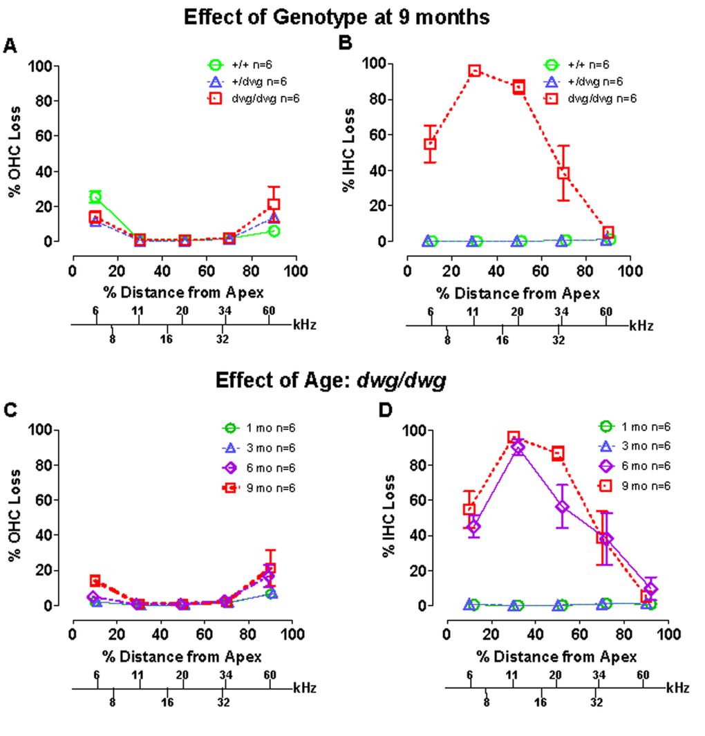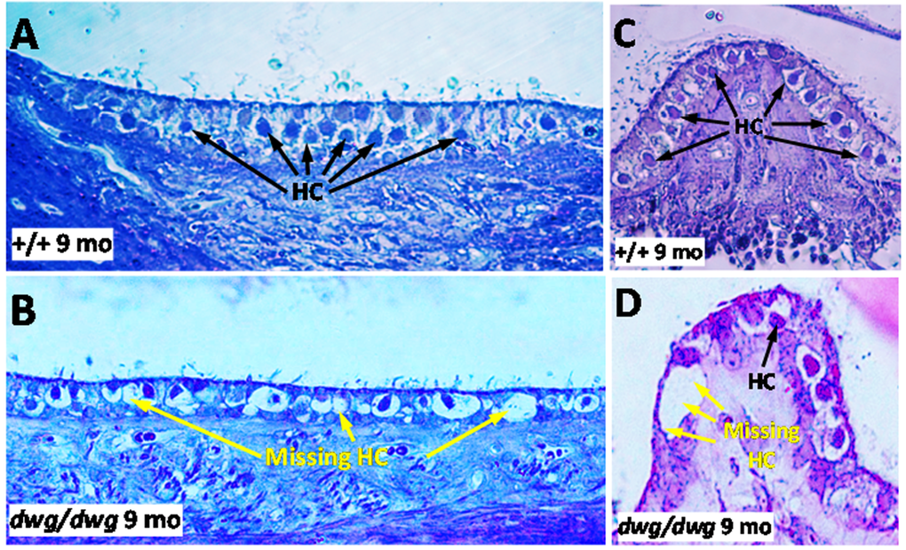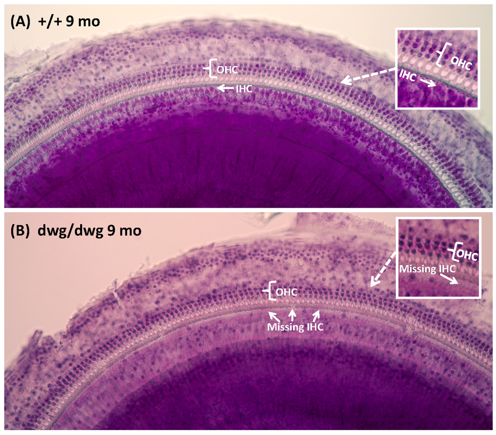 While most cases of hearing loss caused by genetic mutations, ototoxic drugs, acoustic trauma and aging are associated with a primary loss of OHC, hearing loss in dwg/dwg is only associated with IHC with retention of auditory nerve fibers. The time course and location of IHC loss in dwg/dwg mice can be compared to that seen in the few other animal models in which IHC loss is greater than OHC loss to determine if there are common pathological mechanisms.