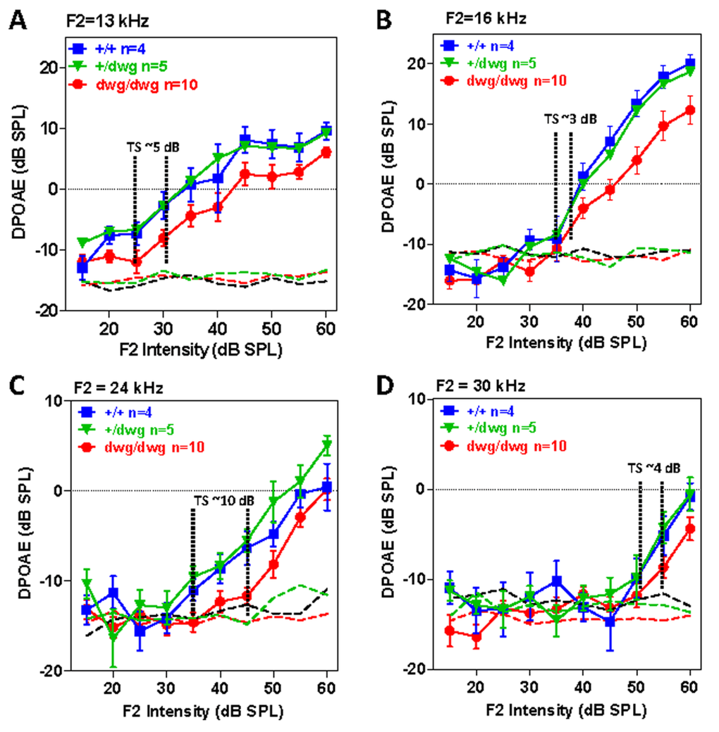 DPOAE provide a noninvasive method for assessing the nonlinear, electromotile response of OHC in collaboration with the endolymphatic potential. We measured the DPOAE I/O functions in different frequency regions in a cohort of 6-month-old +/+, dwg/+ and dwg/dwg mice. DPOAE amplitudes increased with F2 intensity and responses were well above the noise floor in all three genotypes (Fig. 5A-B). While DPOAE I/O functions were nearly identical in +/+ and dwg/+ mice, the amplitudes were slightly lower (~2-8 dB) and the I/O functions shifted to right in dwg/dwg mice. We attempted to estimate the DPOAE “threshold shifts” by drawing vertical lines through the points on each I/O functions at which responses just started to rise above the noise floor (the threshold) and then measured the horizontal distance between the “threshold” of dwg/dwg versus +/+ and dwg/+ mice (Fig. 5A-D). DPOAE “threshold shifts” were approximately 5, 3, 10 and 4 dB at F2 frequencies of 13, 16, 24 and 30 kHz. These results suggest that only a mild functional deficit exists in the DPOAE generators of dwg/dwg mice, possibly in the OHC and/or the stria vascularis that produces the endolymphatic potential or alternatively in middle ear anomalies.