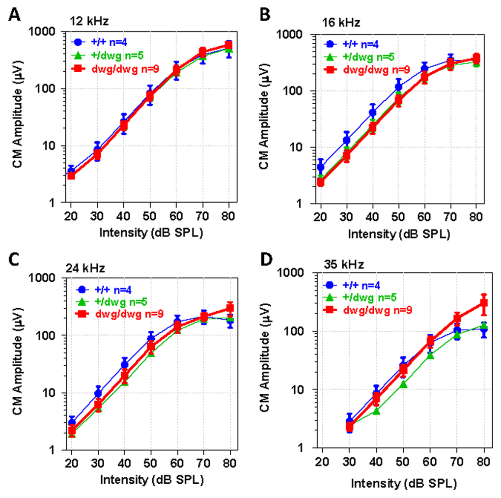 To identify potential dysfunctions in the transduction apparatus of OHC, we recorded CM I/O functions from the round window of the same mice used for DPOAE testing. The CM recorded in this manner is dominated by activity from OHC located near the round window membrane in the high frequency region of the cochlea and is largely independent of IHC loss [37–40]. The CM I/O functions recorded from dwg/dwg mice were very similar to those measured in +/+ and dwg/+ mice with relatively minor differences between the three genotypes at the four frequencies tested, 12, 16, 24 and 35 kHz (Fig. 6 A-D). These results indicate that the transduction apparatus located in the apical pole of OHC is functionally intact, findings that reinforce the view that the CM is predominantly generated by OHC and that IHC loss has little effect on CM amplitude [37, 38].