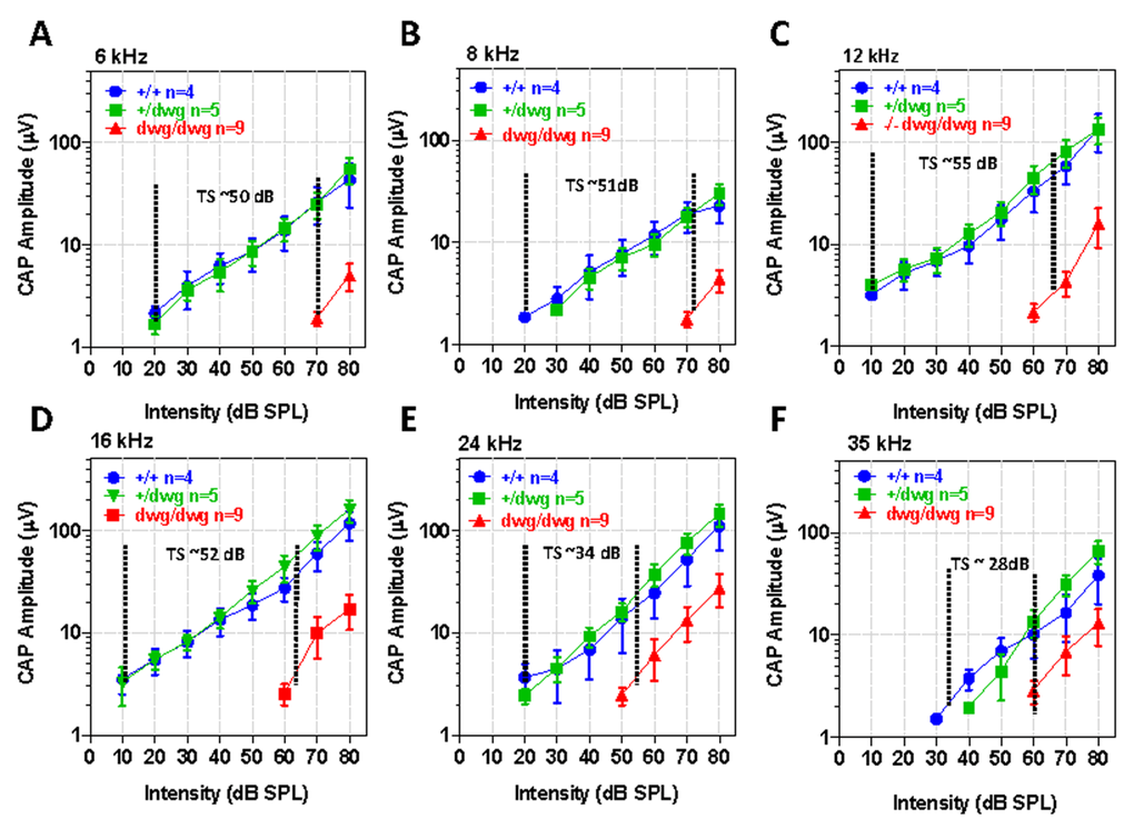 Although DPOAE “thresholds” were elevated in dwg/dwg mice relative to the other genotypes, these shifts were considerably smaller than for the ABR. To identify additional functional deficits downstream of the OHC, we measured CAP I/O functions in the same cohort of mice used above. The CAP is predominantly generated by the synchronous onset response of type I auditory nerve fibers due to the release of excitatory neuro-transmitter from IHC. Therefore, we expected CAP amplitudes would be greatly reduced in dwg/dwg mice. The CAP I/O functions in dwg/+ mice were nearly identical to +/+ mice (Fig. 7A-F). In these two groups, the logarithm of CAP amplitude increased approximately linearly with dB SPL reaching levels exceeding 100 mV from 12-24 kHz. Near-threshold CAP responses of 2-3 mV were detected at levels as low as 10 dB SPL for some frequencies indicative of excellent sensitivity. The CAP I/O functions in the dwg/dwg mice were also linear on a log-log plot; however, the maximum amplitudes were greatly reduced compared with those of +/+ and dwg/+ mice and amplitudes were typically less than 30 mV. We estimated the CAP “threshold shifts” by draw-ing vertical lines through the point on each I/O function at which responses just started to rise above the noise floor (the threshold) and then measured the horizontal distance between the threshold lines of dwg/dwg and +/+ mice (Fig. 7A-F). The CAP threshold shifts were approximately 50, 51, 55, 52, 34 and 28 dB at 6, 8, 12, 16, 24 and 35 kHz respectively, shifts slightly greater than for the ABR (Fig. 1). The CAP threshold shifts were greater at low frequencies than high frequencies, consistent with the location of IHC lesions, which were most severe in the 11-20 kHz region of the tonotopic map and minimal in the extreme base of the cochlea (Fig. 3).
