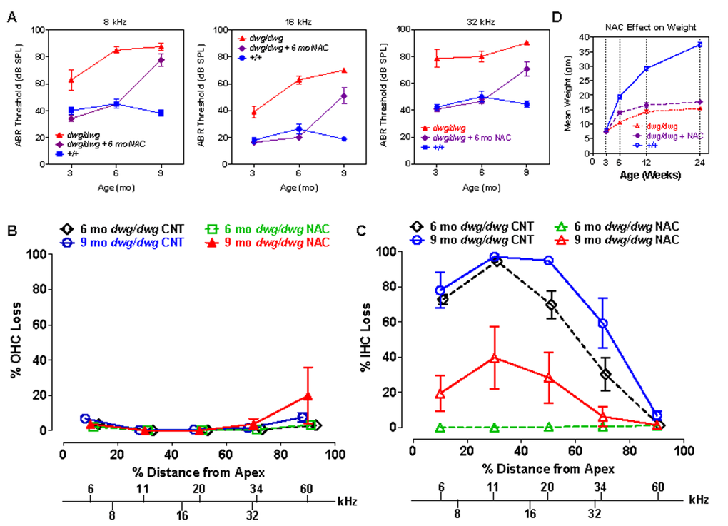 These results indicate that continuous NAC treatment can completely prevent hearing loss and hair cell loss in dwg/dwg mice at least up to 6 months of age. Once treatment is discontinued hearing thresholds increase precipitously nearly catching up to the thresholds in the untreated group at 9 months of age. IHC loss also increases after cessation of NAC treatment; however, it is less severe (or slower to occur) than ABR threshold elevations. We conclude that NAC treatment is an effective otoprotective therapy that can largely abrogate the progressive inner ear dysfunction of dwg/dwg mutant mice. The NAC treatment results also indicate that the hearing loss and IHC loss of dwg/dwg mice are caused by cysteine and GSH deficiencies in the inner ear and are not secondary effects of dwarfism or other non-otic abnormalities.