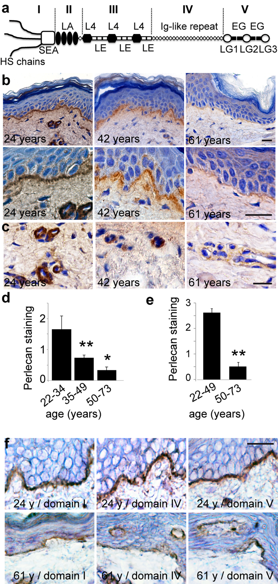 We performed an immunohistochemical analysis of perlecan in a cohort of 38 human skin samples from donors ranging in age from 22 to 73 years. We detected perlecan expression with a monoclonal antibody (mAb) against perlecan domain III (Figure 1a). An analysis of the biopsies from donors that were 22 to 35 years old revealed continuous staining at the DEJ and around dermal capillaries (Figure 1b and c), consistent with previous studies [16,17]. Perlecan staining began to decrease in biopsies from donors aged 39 to 50 years. Perlecan staining again decreased in both intensity and area in biopsies from donors aged 54 to 70 years (Figure 1b and d). This was also observed in the capillary BMs (Figure 1c and e). An analysis of perlecan domains I, IV, and V revealed that all domains were expressed along the DEJ and around dermal capillaries, similar to the domain III expression pattern (Figure 1f). In aged skin, both the DEJ and dermal capillary BM showed reduced staining of each domain; this result suggested that the entire perlecan molecule was subject to expression changes over time.