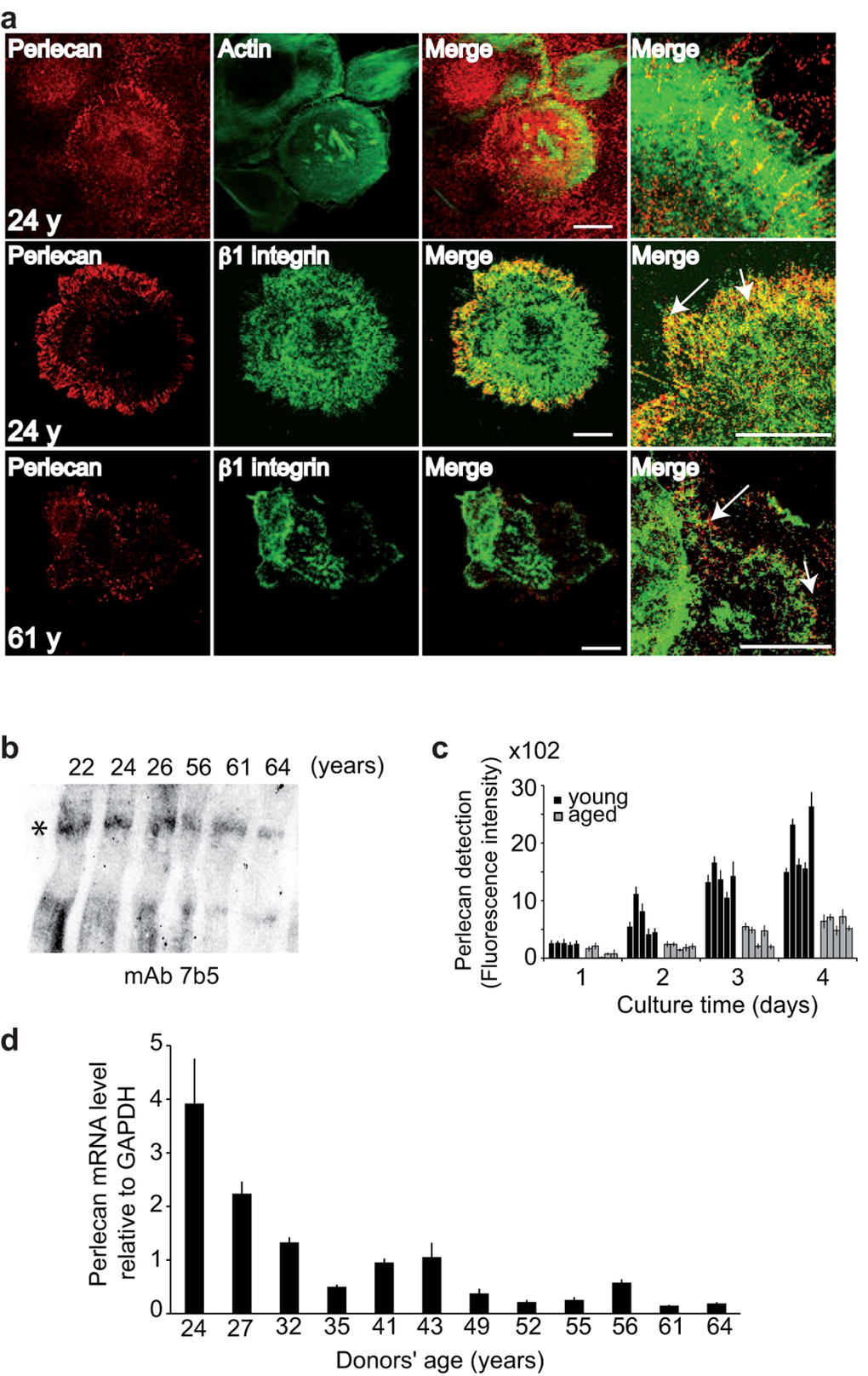 A western blot analysis of perlecan in the ECM of confluent cells from young and aged donors revealed a band of 800 kDa in all samples, which corresponded to the full-length perlecan with intact heparan sulfate (HS) chains (Figure 2b). Because the intensity appeared to slightly decrease with age, we quantified perlecan in 5 young and 5 aged keratinocyte strains (Figure 2c) as a function of cell density to circumvent the bias caused by differences in cell proliferation rates. To that end, we quantified perlecan expression in the ECM of normal human keratinocytes (NHKs) over 4 days with concomitant monitoring of cell proliferation (Additional file 1: Figure S1). The fluorescence intensity of perlecan increased with time in the group of NHKs from young donors, during both cell proliferative and confluent phases. This result showed that perlecan was continuously produced and accumulated in the ECM. In contrast, low levels of perlecan were detected in the NHKs from aged donors. Additionally, the fluorescence intensity detected in the ECM of the NHKs from aged donors on Day 4 was at least 60% lower than that detected in the NHKs from young donors. This finding suggested that less perlecan may be produced and/or retained in the ECM as cells age. To address whether an age-associated decrease in perlecan was linked to genomic breakdown, we generated cDNA from a large panel of primary NHKs obtained from skin donors aged 24 to 64 years old for real-time polymerase chain reaction (QPCR) analyses. As shown in Figure 2(d), the perlecan mRNA levels were reduced in the older age groups. A 75% decrease in perlecan mRNA expression was observed from 24 to 43 years of age, followed by an additional 12% decrease from 49 to 64 years of age. These reductions were consistent with our findings that the perlecan protein levels decreased in aging skin (Figure 1b). These results suggested that perlecan expression in keratinocytes was down-regulated at the transcriptional level without excluding a potential additional post-transcriptional regulation.