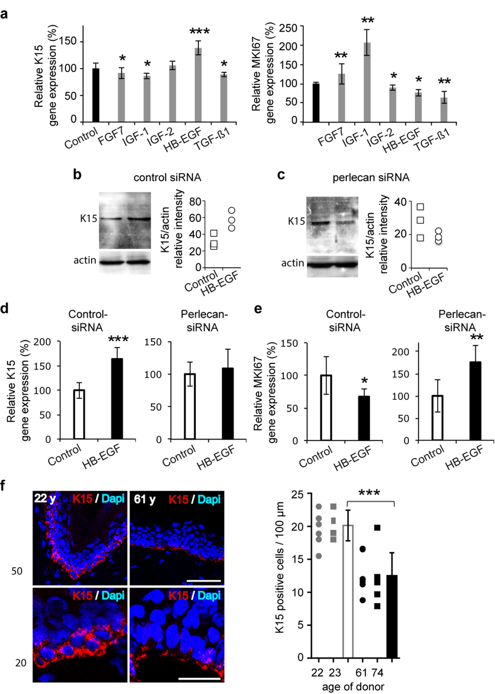 Perlecan is known to bind to many growth factors, including FGF7, which plays an important role in keratinocyte survival [10]. Therefore, we analysed FGF7, and other selected growth factors potentially involved in epidermal differentiation, to determine whether they impacted K15 expression. Simultaneously, we also verified their expected impact on keratinocyte proliferation. As previously reported, we found a slight, but significant, reduction in K15 mRNA expression levels in cells treated with either FGF7 or transforming growth factor beta 1 (TGF-Δ1) (Figure 4a) [20]. Among the other tested growth factors, we found a reduction or no change in K15 gene expression after treating with insulin growth factor (IGF)-1 or -2, respectively, and a very significant increase after treating with heparinbinding epidermal growth factor (HB-EGF). To determine whether perlecan was involved in HB-EGFinduced K15 expression, we treated perlecan knockdown cells with HB-EGF. Western blotting (Figure 4c) experiments confirmed that K15 expression was increased in control-siRNA transfected cells, and K15 expression was decreased in perlecan-siRNA transfected cells. The QPCR analysis, which confirmed these results, also drew our attention to the changes induced by HB-EGF treatment. We found that HB-EGF promoted diametrically opposite keratinocyte proliferation signals, depending on perlecan expression (Figure 4d, Additional file 4 : Figure S4). These results revealed that perlecan played a role in HB-EGFmediated regulation of proliferation and K15 expression in basal keratinocytes.