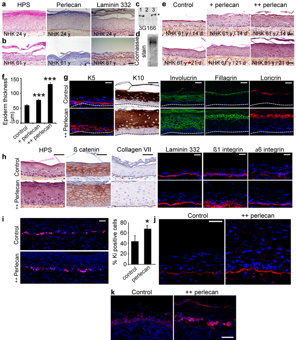 Finally, to analyze the impact of keratinocyte aging on perlecan expression in three-dimensional conditions, in vitro skin equivalent (SE) models were produced. These SEs were composed of a previously described dermal equivalent (DE) made of foreskin dermal fibroblasts seeded in a porous dermal substrate (collagen, glycosaminoglycans, and chitosan), on top of which NHK were seeded [22]. As shown in Figure 5a, when 24 year old donor's NHK were seeded, the DE supported epidermal proliferation giving rise to a full thickness and well organized, terminally differentiated epidermis at day 21 that displayed perlecan expression evenly along the DEJ. As previously documented [22], normal differentiation stages were indicated by expression of the early differentiation marker K10 in the supra-basal layers, the intermediate differentiation marker involucrin in the spinous layer, and the late differentiation markers filaggrin and loricrin in the stratum corneum. Seeding 61 years old donor's NHK over these DEs led to an obvious decrease in epidermal thickness (Figure 5b). Only little perlecan was found in the DEJ while laminin 332 was still expressed. The reduction in cell layers was accompanied by anomalies in the differentiation markers staining (Additional file 5: Figure S5), reflecting disorganization and abnormalities in the differentiation process. These data show that aged skin keratinocytes are unable to form a multi-layered well-differentiated epidermis in three-dimensional culture conditions. To address whether the defect in epidermal formation with aging is influenced by perlecan expression, we epidermalized SEs with the 61 years old donor's NHK in the presence of purified human perlecan. Perlecan was immunopurified from the conditioned medium of human coronary arterial endothelial cells as described previously [23] (Figure 5c and d). Epidermis made from aged skin NHK was thin and poorly organized, reaching a 50 μm depth at day 21 (Figure 5e and f). Exogenous addition of perlecan at 5 μg/ml (+ perlecan), restored the ability of aged NHK to form a multi-layered epidermis, which was already visible at day 14 and reached 100 μm thickness at day 21, where differentiation layers were readily distinguishable (Figure 5e and f). An additional application of perlecan (++ perlecan) further enhanced this phenomenon as evidenced by the 150-μm epidermal thickness obtained at day 21. Perlecaninduced improvement of the epidermal differentiation process was apparent after HPS staining (Figure 5h), and we analysed the differentiation markers expression at day 21 (Figure 5g). Interestingly, the K5 staining revealed that the basal keratinocyte layer was enlarged. The early differentiation marker K10 was expressed in all suprabasal layers, indicating that a normal differentiation process occurs in the perlecan-restored epidermis. Staining of the intermediate differentiation marker involucrin revealed a large multilayer zone containing well delineated and organized cells, in contrast to those found in the flat and packed epidermis of the control SE. Staining of filaggrin in the spinous layer and loricrin in the stratum corneum both revealed thicker sections containing healthy and actively producing cells compared to the thin and poorly organized layers obtained in the control SE. These results suggest that supplementing SE with perlecan allowed the aged skin keratinocytes to accomplish each differentiation phase, whereas they seemed incomplete and cell-deprived in the control SE. Staining of collagen VII and laminin 332 revealed a regular BM below the epithelium of both models, appearing thicker and less interrupted in the perlecan-treated SEs (Figure 5h). The addition of perlecan modified the β1 and α6 integrin patterns both in intensity and localization (Figure 5h); suggesting that perlecan favoured keratinocyte cohesion in the basal layer. The increase in K5-positive cells in perlecan-treated SEs suggested increased proliferation of basal cells. With Ki-67 staining, we found that the abundance of Ki-67-positive cells in the basal layer was 24% higher in the perlecan-treated SEs than in untreated SEs (Figure 5i). This result suggested that adding soluble perlecan enhanced the proliferation of basal cells. An examination of perlecan expression revealed stronger staining in the BM of treated SEs than in the BM of untreated SEs (Figure 5j). This result showed that some of the added perlecan reached the BM. However, a punctuated, circular staining pattern was observed throughout the epidermis, which suggested that some perlecan was trapped between keratinocytes. Analysis of K15 expression revealed that K15- expressing cells were present in the basal layer of perlecan-treated SE, but only a few were observed in untreated SE (Figure 5k). As previously documented, the presence of Ki-67-positive cells in the K15-positive basal layer indicated that this layer maintained a healthy, self-renewing, proliferative compartment [24].