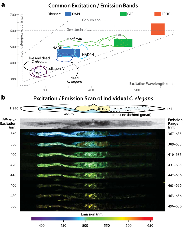 Despite this, many studies use accumulation of intestinal autofluorescence in C. elegans to measure whether particular interventions improve health or slow aging. Moreover, there is little standardization regarding what excitation / emission wavelengths to use for this analysis. Some studies have focused on autofluorescence in blue emission wavelengths [13,16,17], others in cyan [20] and green ranges [19,21], and yet others on red emissions [18]. Figure 1a provides a schematic relating excitation and emission wavelengths of common fluorescent biomolecules to visible colors. This diversity likely reflects a discrepancy long noted in studies of lipofuscin and related compounds: viewed in vivo, these materials are generally observed to fluoresce with emission colors from yellow-green to red; however, when solvent-extracted for detailed characterization, the same materials fluoresce in blue wavelengths [10,22]. C. elegans studies with their roots in the biochemical characterization of these materials [12,14] typically focus on UV excitation with blue emissions, while other studies focus on the green-to-red color familiar to C. elegans microscopists.