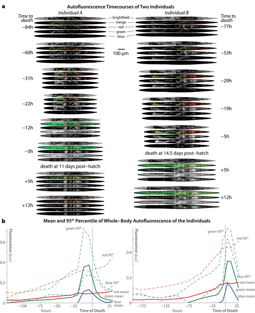 Images at 10× magnification in the three fluorescence ranges illustrated in Figure 1a were collected for each individual every eight hours. Animals were assumed to be alive after each time-point if there was visible movement following blue-light stimulus. This produced a detailed survey of C. elegans autofluorescence across space and time, and among individuals.