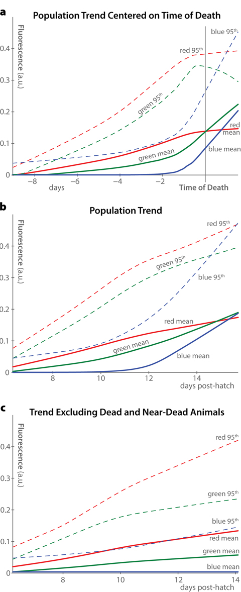 While Figure 2 presents data from only two individuals, the same measures averaged across the 40-animal population are shown in Figure 3. Mean and 95th-percentile fluorescence were calculated for each individual at each time-point, and the mean of these measures across the whole population is plotted as a function of time. This analysis shows that, when centered at the time of death (Figure 3a), the population trends are very similar to the individual trends described above: a consistent increase of red autofluorescence over time, a peak in blue autofluorescence only near death, and a combination of both of these patterns in green.