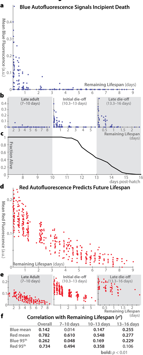 Figure 4 shows remaining lifespan plotted against autofluorescence for each individual in our population, at each time-point measured. Across all ages, blue autofluorescence is weakly correlated with remaining lifespan, and this correlation is driven entirely by animals within a day of death (Figure 4a). Moreover, for animals in late adulthood (after the reproductive span but before the onset of mortality), blue autofluorescence is entirely unrelated to remaining lifespan (Figure 4b). In contrast, red autofluorescence is highly predictive of remaining lifespan in the overall population, in late adulthood, and in older populations (Figure 4d,e). Only in highly aged animals in which nearly the whole population is within a day of demise does the level of blue autofluorescence become more predictive of remaining lifespan than that of red autofluorescence.