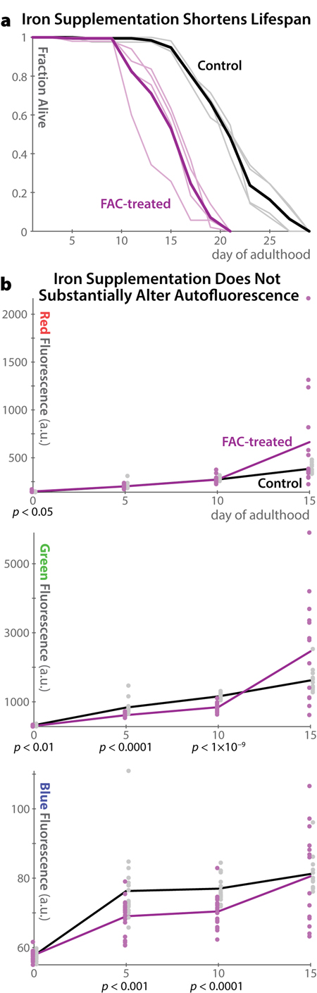 As lipofuscin is believed to consist of highly oxidized proteins and lipids, it is unsurprising that previous observations of mammals and mammalian cells have found that conditions in which oxidative damage is increased also raise lipofuscin levels. In particular, both high O2 concentrations and supplementation with redox-active iron increase endogenous autofluorescence in multiple in vivo and in vitro experiments in different mammalian models(reviewed in ref. [7]). In C. elegans, media supplemented with 15 mM ferric ammonium citrate has been shown to increase oxidative damage (as measured by protein carbonylation) [17,23] and shorten lifespan [23]. However, such supplementation was previously reported to not increase blue auto-fluorescence [17]. As mammalian lipofuscin is often reported to fluoresce in green to red wavelengths when viewed in vivo [10], we hypothesized that, though blue autofluorescence in C. elegans appears to be distinct from mammalian lipofuscin [17], green or red autofluorescence might increase following oxidative damage. We therefore repeated the analysis of C. elegans autofluorescence with redox-active iron supplementation from ref. 17, and extended it to green and red fluorescent wavelengths (Figure 5). We confirmed that iron supplementation shortens lifespan dramatically (Figure 5a); however autofluorescence is not much altered at any time in any wavelength (Figure 5b). Indeed, all significant changes between control and treatment groups are in the direction of reduced auto-fluorescence. Examining autofluorescence specifically in the intestine or gonad produced identical results (data not shown). While inter-individual variability in autofluorescence is increased in iron-treated animals at very late timepoints, there is no evidence of wholesale increases in blue, green, or red autofluorescence as a result of these pro-oxidation conditions. These results corroborate previous observation of no increase in blue autofluorescence in mutant C. elegans strains that produce high levels of reactive oxygen species [16], and stand in marked contrast to the behavior of lipofuscin as characterized in mammals.