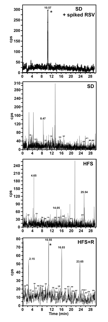 Adult male rhesus monkeys (average age at baseline 10.5 ± 0.4 years) were fed a SD, HFS or HFS supplemented with RSV (HFS+R) diet for 24 months. Following euthanasia, RSV was detected in CSF of rhesus monkey on HFS+R diet, but not in SD- or HFS-fed animals (Fig. 1). No attempts were made to identify metabolites of RSV; however, we previously reported the detection of RSV and resveratrol-3-O-sulfate in the serum of HFS+R-fed animals, but not of resveratrol-4′-O-glucuronide nor 3-O-glucuronide, which were below the minimum quantitation limits [30]. There are no data available about concentrations of RSV in CSF in year 1.