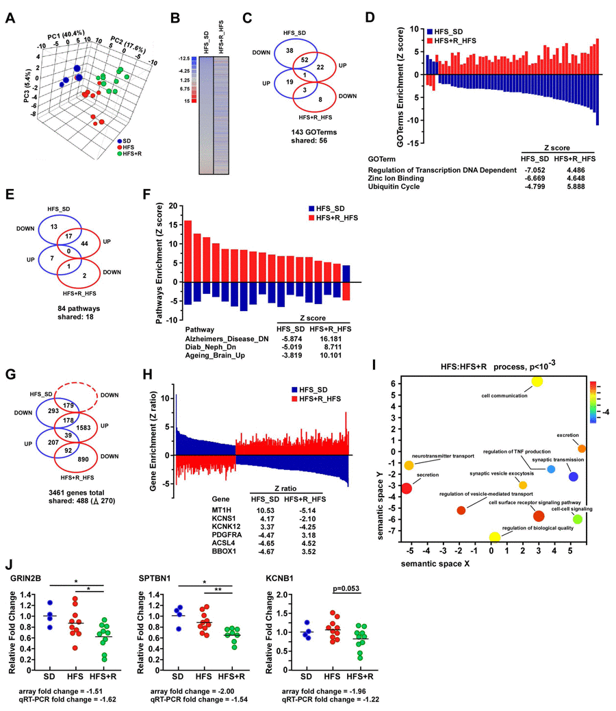 Expression of GRIN2B and SPTBN1 mRNA levels was significantly lower in HFS+R vs. SD and HFS groups, while the reduction in KCNB1 mRNA did not quite reach conventional levels of statistical significance (p= 0.053). Nevertheless, the changes in the mRNA transcript levels between the microarray and quantitative RT-PCR data were identical in terms of direction and magnitude of changes (Fig. 2J).