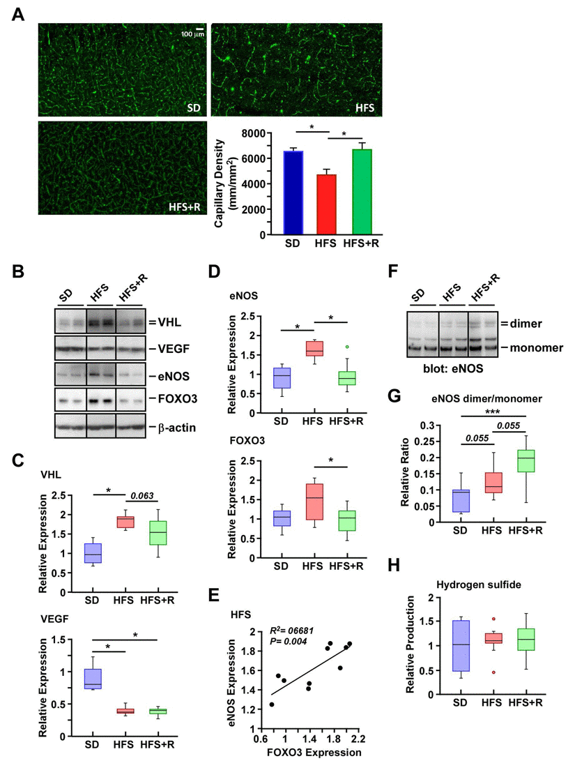 HFS is associated with alterations in cerebral vasculature, and consumption of RSV ameliorates endothelial hyperpermeability in HFS-fed rats partly via eNOS regulation [60]. We showed that the dysfunction of eNOS through homodimeric uncoupling provided a mechanism for diet-induced brain insult. Importantly, eNOS dimer stabilization was observed in the cerebral cortex of the HFS+R group vs HFS, and RSV supplementation was found to attenuate HFS-mediated induction of eNOS protein and its transcriptional activator FOXO3. The higher levels of eNOS in the HFS group may be an attempt in trying to improve blood flow in the presence of low capillary density due to HFS. Notable are the studies in which H2S was reported to affect eNOS function while playing a cardinal role in the protection of neurons from secondary injury by functioning as an anti-oxidant and anti-inflammatory mediator (reviewed in Ref. [61]). We could not demonstrate the contribution of H2S in modulating eNOS dimer/monomer ratio and/or activity due to large intra-individual variations among the groups. Similar to the protective effects of RSV in the monkey central arterial wall [32], RSV may potentially reduce the HFS-induced cerebrovascular inflammation by limiting transport of circulating cytokines across the blood-brain barrier, lending credence to the report of Chang et al. [62], who showed that high-fat diet supplementation with RSV for 8 weeks significantly reduced the disruption of the blood-brain barrier while protecting brain neurons in the mice from apoptotic insults. Based upon these results, it would have been interesting to perform a long-term dietary stress first and then initiate RSV supplementation in order to restore the cortical brain capillary density and protect against neuronal brain insults.