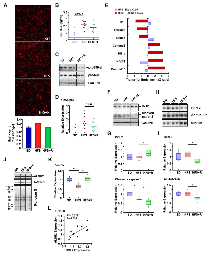 There was no significant difference in the number of cells positive for the microglial marker Iba1+ among the groups (Fig. 4A). Despite the low sample size in the SD group, evidence was provided for higher levels of IL-6 in CSF after HFS feeding (p = 0.0424, Fig. 4B) and for the lack of difference between the HFS and HFS+R groups. Additionally, the increased ratio of phospho-active to total form of NF-κB p65Rel in response to HFS vs. SD was not conclusive (Fig. 4, C and D), and neither was the difference in the activation state of p65Rel between the HFS+R group and HFS (p = 0.057, Fig. 4, A and D).