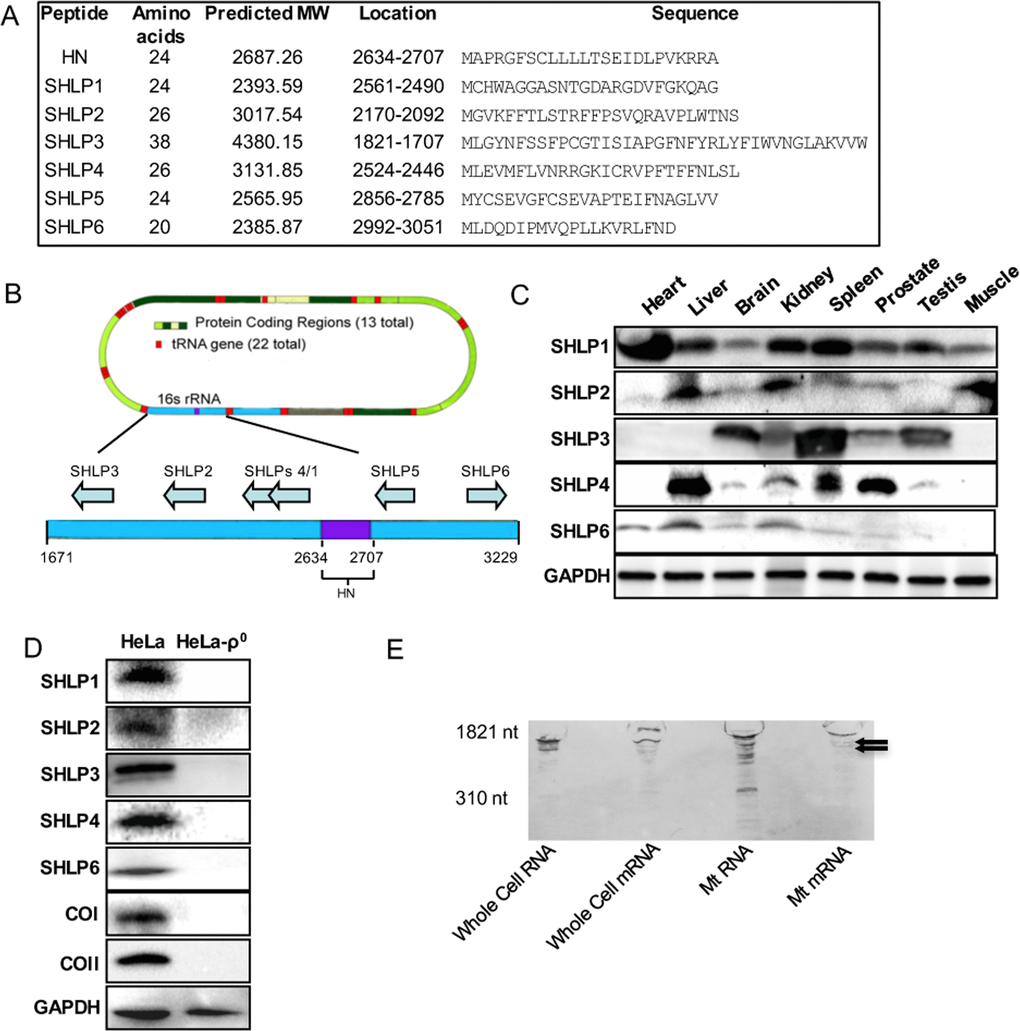An in silico search for potential sORFs within 16S-rRNA-encoding short peptides (20–40 amino acids) returned six sequences encoding 20–38 amino-acid-long peptides (Fig. 1A, B), which we named SHLP 1–6. To assess potential endogenous expression, antibodies against SHLPs 1, 2, 3, 4, and 6 were generated; immunoblotting was used to assess SHLP expression in mouse tissues including the heart, liver, brain, kidney, spleen, prostate, testis, and skeletal muscle. Despite multiple attempts, we were unable to obtain a specific antibody against SHLP5. Multiple mouse tissues expressed SHLPs 1–4 and 6 at varying levels (Fig. 1C). We observed organ-specific expression of individual SHLPs. Specifically, SHLP1 was detected in the heart, kidney, and spleen; SHLP2 was detected in the liver, kidney, and muscle; SHLP3 was detected in the brain and spleen; SHLP4 was detected in the liver and prostate; and SHLP6 was detected in the liver and kidney.