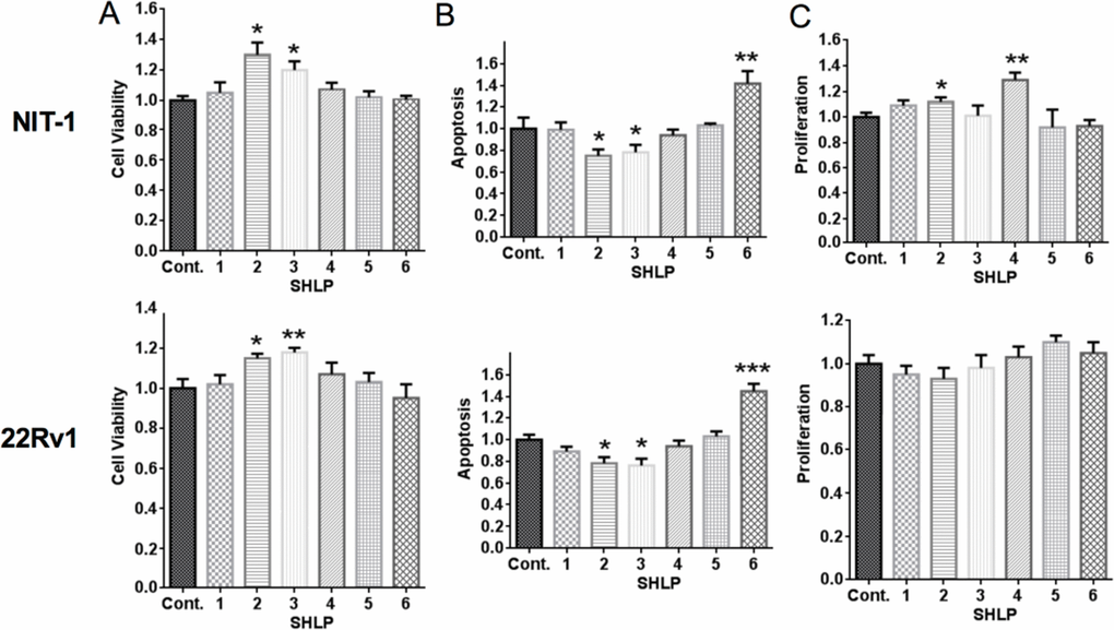 After assessing the expression of endogenous SHLPs, we next determined their physiological roles. Murine β-cells (NIT-1) and human prostate cancer cells (22Rv1) were incubated with control peptide or SHLPs 1–6 under serum-starved conditions. Cell viability was assessed by an MTS ([3-(4,5-dimethylthiazol-2-yl)-5-(3-carboxymethoxyphenyl)-2-(4-sulfophenyl)-2H-tetra-zolium) assay, apoptosis was assessed by DNA fragmentation, and cellular proliferation was assessed by BrdU (bromodeoxyuridine) incorporation. SHLP2 and SHLP3 enhanced cell viability (Fig. 2A) and decreased apoptosis in both NIT-1 and 22Rv1 cells (Fig. 2B). SHLP2 and SHLP4 promoted cell proliferation in NIT-1 β-cells (Fig. 2C). SHLP6 significantly increased apoptosis in both NIT-1 and 22Rv1 cells (Fig. 2B), having an effect opposite of SHLP2 and SHLP3.
