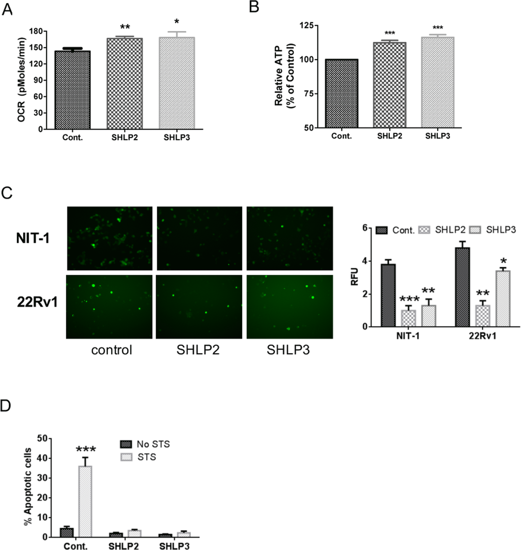 During oxidative stress, cellular ROS accumulation is associated with mitochondrial dysfunction [22] and aging; however, an increase in ROS may be beneficial in specific circumstances [23]. Having previously shown that HN can protect against ROS formation stimulated by oxidized low-density lipoprotein (LDL) in human aortic endothelial cells [12], we hypothesized that SHLP2 and SHLP3 may have similar effects against ROS production. Pre-incubation of NIT-1 and 22Rv1 cells with SHLP2 or SHLP3 overnight significantly suppressed serum-starvation-dependent ROS production (Fig. 3C), suggesting a cytoprotective role.