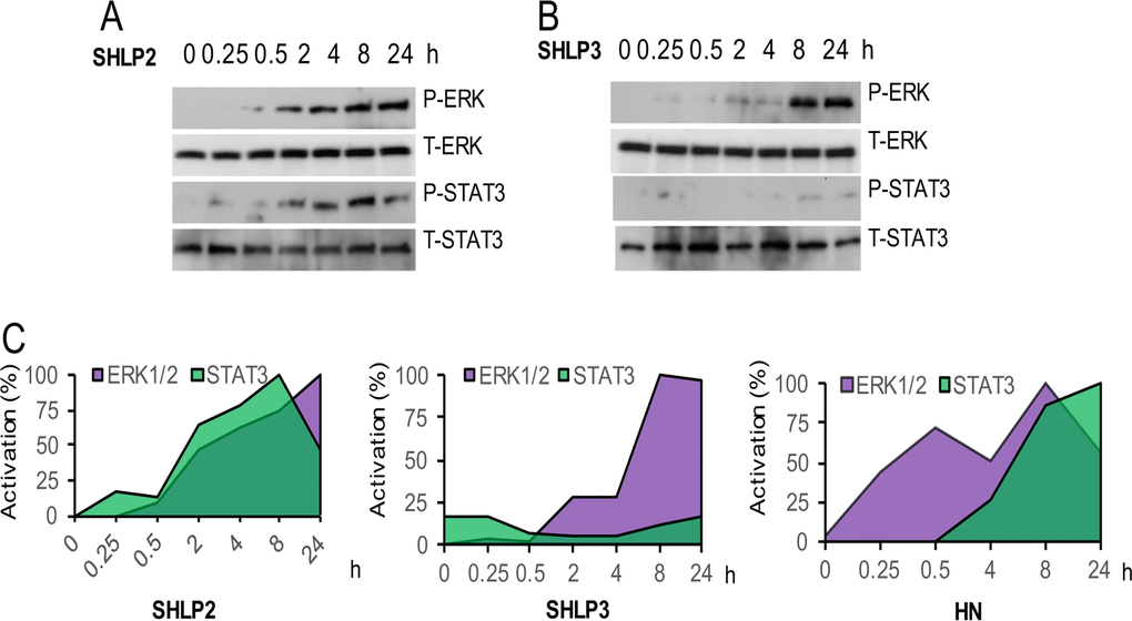 Similar to HN, SHLP2 and SHLP3 induce ERK (extracellular signal-regulated kinase) and STAT-3 (signal transducer and activator of transcription 3) phosphorylation