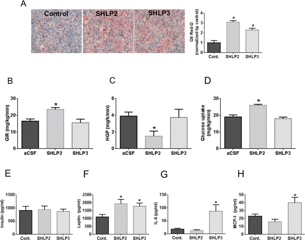 Inflammation has been linked to insulin resistance [27] and increased pro-inflammatory cytokines, such as TNF-α (tumor necrosis factor α), have been shown to cause insulin resistance in experimental models [28–30]. To assess the modulating effect of SHLP2 and SHLP3 on metabolic and inflammatory profiles, we treated C57BL/6 mice with a control peptide, SHLP2, or SHLP3 for 5 days (2 mg/kg/dose, BID and examined the levels of several biomarkers by LINCOplex™. Consistent with our in vitro data with 3T3-L1 cells, the leptin levels increased with SHLP2 and SHLP3 treatment (Fig. 5E) with no change in body weight or food intake (data not shown). SHLP2 treatment did not alter the insulin, interleukin-6 (IL-6), or monocyte chemotactic protein-1 (MCP-1) levels (Fig. 5E–H). In contrast, SHLP3 treatment significantly increased IL-6 and MCP-1 levels, but also had no effect on insulin levels (Fig. 5E–H).
