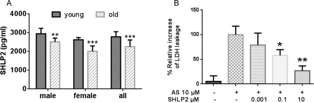 Mitochondria have been implicated in increased lifespan in several life-extending treatments [39, 40]; however, it is not known whether the relationship is correlative or causative [40]. Additionally, it is well known that hormone levels change with aging. For example, levels of aldosterone, calcitonin, growth hormone, and IGF-I decrease with age. Circulating HN levels decline with age in humans and rodents, specifically in the hypothalamus and skeletal muscle of older rats. These changes parallel increases in the incidence of age-associated diseases such as AD and T2DM. The decline in circulating SHLP2 levels with age (Fig. 6), the anti-oxidative stress function of SHLP2 (Fig. 3C), and its neuroprotective effect (Fig. 6B) indicate that SHLP2 has a role in the regulation of aging and age-related diseases.