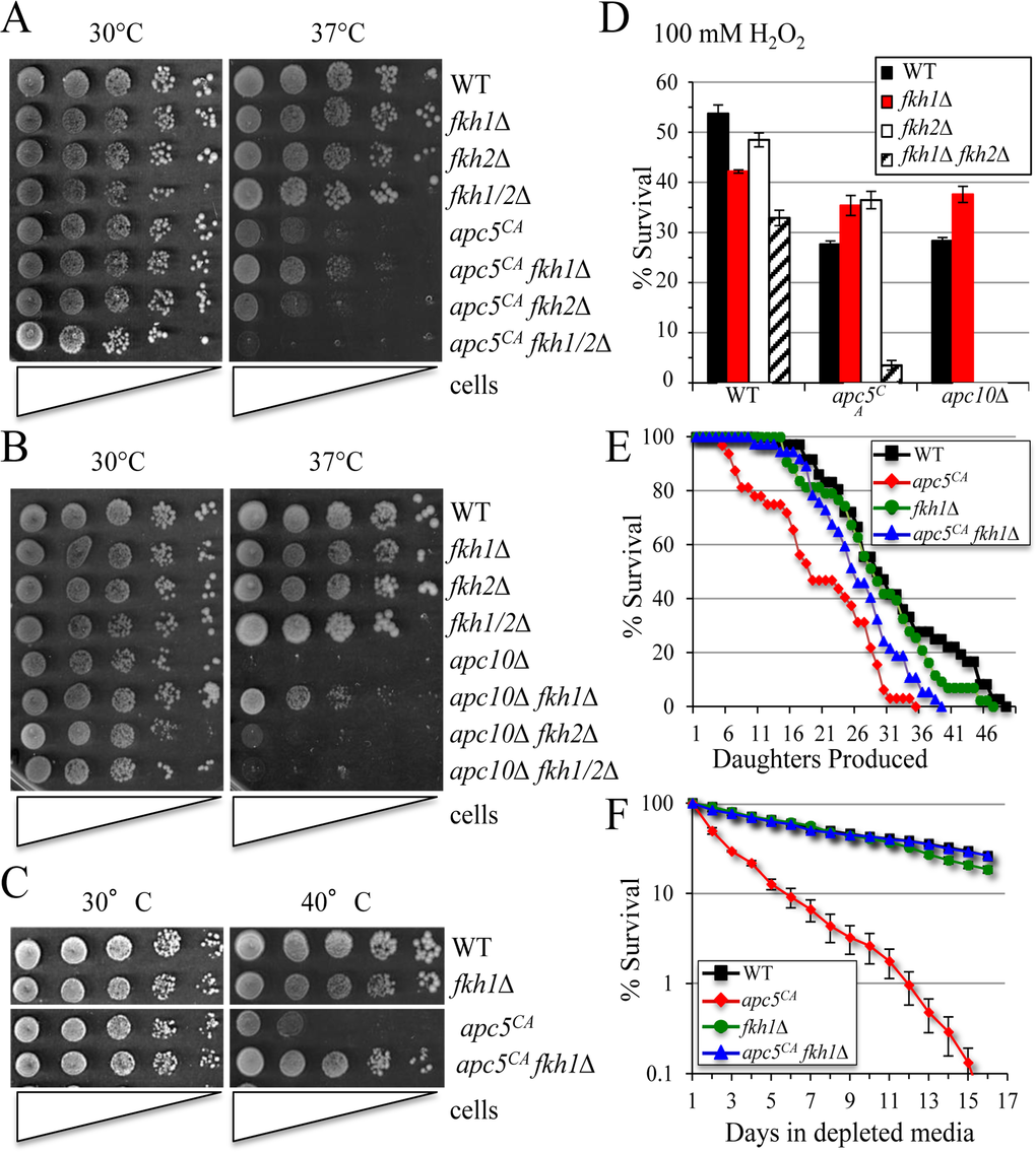 An interdependence also exists in yeast between the APC and the Fkh proteins that impacts lifespan and stress response [5, 11]. Fkh1 and Fkh2 proteins can both activate the APC under normal growth conditions to coordinate cell cycle progression [5]. The APC is a multi-subunit ubiquitin ligase, or E3, that is predominantly known as being required for cell cycle progression through mitosis and for G1 maintenance, in lower and higher eukaryotes [24, 25]. Cdc20 controls APC function through mitosis, while Cdh1 regulates APC-dependent processes through G1 passage. We have described biological roles affected by the APC that go beyond lifespan, including critical functions in stress response, mitotic chromatin assembly, and mitotic-associated histone modifications [4, 26-29]. We observed that deletion of both FKH genes was necessary to further impair mutant APC phenotypes, such as sensitivity to temperature and oxidative stress, and reduced lifespan, indicating how important this combination of genes is to cell health and adaptive survival.