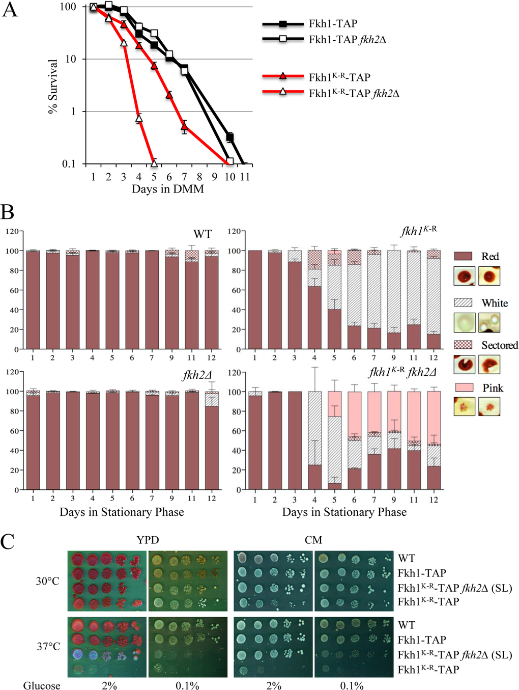 Color sectoring of yeast colonies is a marker of genomic instability, and we serendipitously observed that individual cells plated during the CLS experiment were sectoring, depending on genetic background. Colonies derived from the WT and fkh2Δ strains did not sector (Fig. 10B). Samples of sectored colonies are shown in the inset for Fig. 10B. However, the red fkh1K-R FKH2 mutant colonies generated significant numbers of sectored red:white, and white colonies. This occurs when the red phenotype of ade2 mutants revert to white, due to spontaneous genomic mutation [47]. Mutations leading to red:white sectoring occur after plating, whereas the white colonies are due to mutations occurring prior to plating. The longer the cells sat in stationary phase, the more red:white colony sectoring occurred (Fig. 10B). Strikingly, it was most prevalent in the short-lived fkh1K-R fkh2Δ cells. Pink speckled colonies began to appear suggesting that mutations causing color change were ongoing and persistent despite being in stationary phase. Thus, the lifespan defect in Fkh1K-R cells appears to be linked with severe genomic instability.