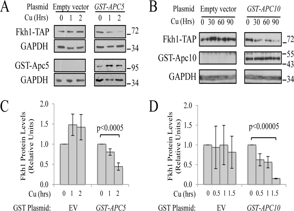 If Fkh1 degradation is indeed dependent on the APC E3 activity, then increased APC subunit expression may further decrease Fkh1-TAP levels through enhanced E3 activity. When plasmids expressing copper-inducible promoter (CUP1prom) driven GST-APC5 (Fig 3A) or GST-APC10 (Fig. 3B) were expressed in Fkh1-TAP cells, we indeed observed that Fkh1-TAP levels decreased as compared to empty vector controls. Interestingly, Fkh1-TAP levels increased in response to copper alone, potentially due to induction of Fkh1 by the heavy metal stress. Taken together, these observations are consistent with the idea that Fkh1-TAP instability is APC, ubiquitin- and proteasome-dependent.