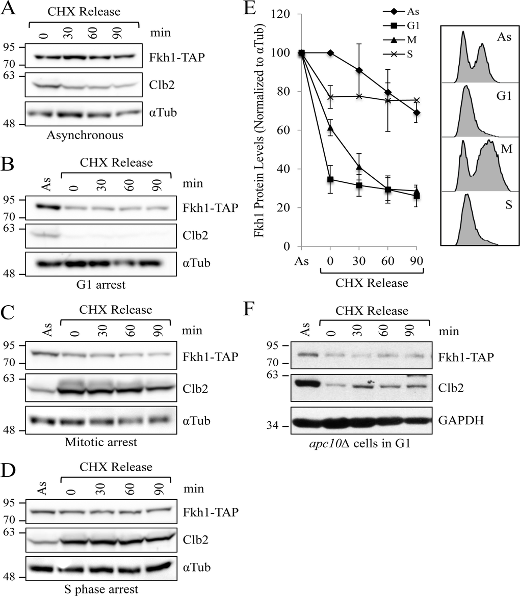To determine whether Fkh1 stability is correlated with specific positions within the cell cycle, we arrested Fkh1-TAP expressing cells at various points in the cell cycle. CHX was then added to block further protein synthesis with samples removed every 30 minutes to assess protein stability from the arrest point forward (Figs. 4A-D). We observed that Fkh1-TAP was at its lowest level during G1, but remained stable (Figs. 4B, 4E). In contrast, Fkh1 is unstable during mitosis in the WT strain (Figs 4C, 4E). Stable Fkh1-TAP appears to again accumulate during S phase (Figs. 4D, 4E), consistent with cyclical FKH1 mRNA expression throughout the cell cycle, which peaks during S phase [41]. In apc10Δ cells, Fkh1-TAP protein levels in G1 arrested cells, compared to G1 arrested WT cells, was higher when compared to asynchronous cells (Figs. 4F, S4C). Thus, these results indicate that Fkh1-TAP is specifically targeted for degradation at the onset of mitosis by the APC, which is also active at the onset of mitosis.