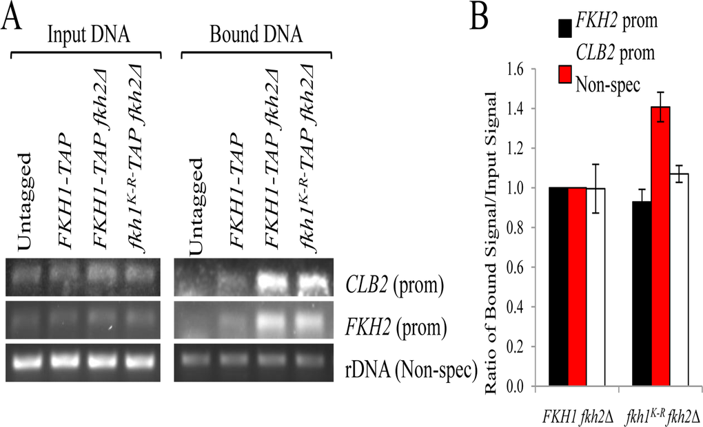 Given the flocculent phenotype of fkh1K-R fkh2Δ cells (Fig. 6B), consistent with a defective Fkh1 protein, we asked if the K373R mutation impaired the core ability of Fkh1: binding promoter DNA. We used chromatin immunoprecipitation (ChIP) in asynchronous cells, with primers designed to amplify the CLB2 and FKH2 promoters, as Fkh1 binds these promoters (Fig. 7) [46]. The high abundance of rDNA, leading to nonspecific interactions with the beads, allows it to be used as a load control. In the bound lanes, Fkh1-TAP was observed at both CLB2 and FKH2 promoters, with Fkh1-TAP abundance clearly increased when FKH2 was deleted (the FKH2 promoter is still present in the FKH2 coding region deletion). Thus, the ability of Fkh1 to compensate for Fkh2 [37] likely involves increased Fkh1 recruitment to promoters in the absence of FKH2. The stable Fkh1K-R protein was bound to both CLB2 and FKH2 promoters at WT levels, demonstrating that the Fkh1K-R defect, leading to flocculence in the fkh2Δ background, is not due to impaired promoter binding, at least at CLB2 and FKH2.