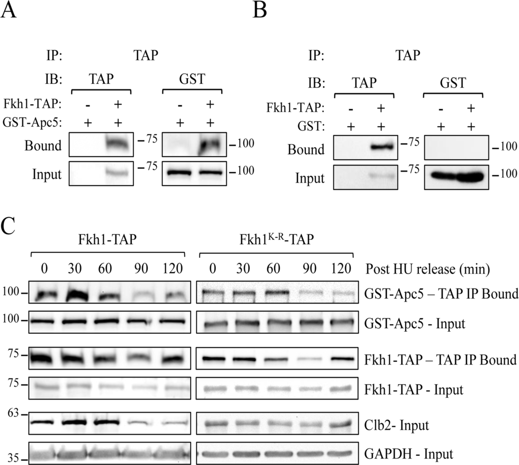 We next asked if the Fkh1-Apc5 interaction is cell cycle dependent, perhaps preceding mitosis when Fkh1 is degraded. To determine this, we arrested the Fkh1-TAP cells in S phase, with samples removed for CoIP every 30 minutes after synchronous release back into the cell cycle (Fig. 8C). Apc5 co-immunoprecipitated with Fkh1 throughout the cell cycle, and its levels were proportional to Fkh1. Apc5 likewise continued to be observed in Fkh1K-R precipitates, with levels also proportional to the amount of Fkh1 IP'd. Our observations therefore suggest that Fkh1 and Apc5 are physically bound throughout the cell cycle, even though Fkh1 degradation only occurs during mitosis, and the stabilizing K373R mutation is irrelevant for this interaction.