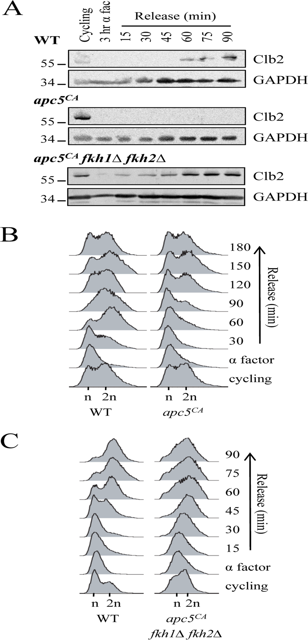 The demonstration that the APC is required to target Fkh1 for degradation leads to the next question: what is the biological significance of this interaction? We hypothesized that Fkh1 degradation in mitosis is necessary to facilitate ordered cell cycle progression into G1. Furthermore, we propose that this progression involves Fkh1-dependent transcriptional control of Clb2, based on a combination of several observations: asynchronous apc5CA mutants exhibit high Clb2 and Fkh1 protein levels (Figs. 2A, 2B) [6, 28]; G1 arrested apc5CA mutants exhibit very low Clb2 levels (Figs. 9A, S4A); and Fkh proteins normally repress CLB2 expression during G1 [19, 23]. Together, this raises the possibility that the higher levels of Fkh1 protein (in G1 arrested APC mutants) could be keeping Clb2 protein levels low through transcriptional repression. To test this, WT, apc5CA and apc5CA fkh1Δ fkh2Δ cells were arrested in G1, then released back into the cell cycle with samples removed to determine Clb2 protein levels (Fig. 9A). Our hypothesis predicts that removal of Fkh1/2 function in the mutant APC background will return Clb2 protein levels to near normal. In apc5CA mutants, Clb2 was not apparent until after 90 minutes, and it took 120 minutes for cells to begin to move into G2/M. However, in apc5CA fkh1Δ fkh2Δ cells, Clb2 expression was clear after 15 minutes, with a synchronous movement of cells into S phase as early as 30 minutes (Figs. 9A, 9C). In WT cells, Clb2 protein levels begin to accumulate again after 60 minutes, which coincided with movement of cells from G1 to G2/M (Figs. 9A, 9B). These experiments, therefore, provide the biological relevance of Fkh1 degradation in mitosis as being essential for normal cell cycle progression.