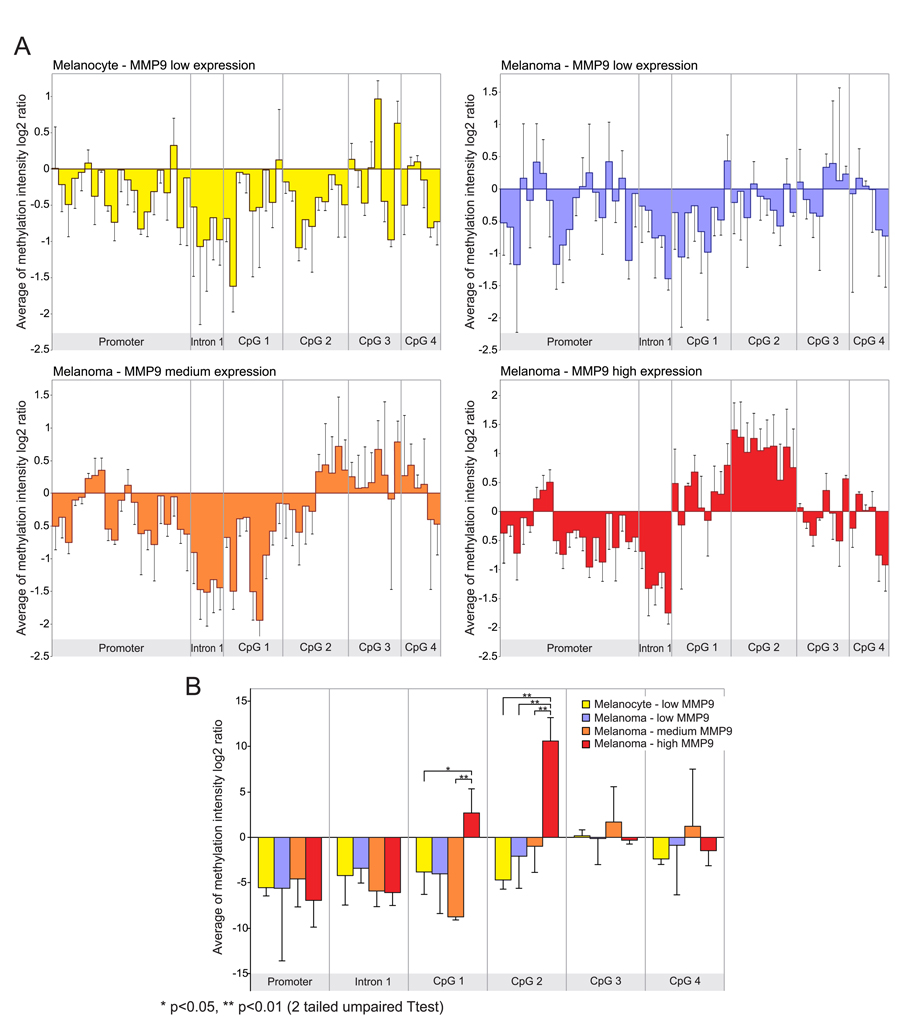 On these bases, we first performed computational analysis to assess the methylation patterns of MMP9 gene in melanoma samples according to mRNA expression. Such analysis revealed that hypermethylation was observed at the CpG-2 intragenic region in the group with higher MMP-9 expression levels. Accordingly, our in vitro experiments demonstrated that MMP9 CpG-2 methylation hotspot was correlated with higher transcript and protein levels of MMP-9 in melanoma cell lines. Then, the intervention of epigenetic modifications may be associated with MMP-9 overexpression.