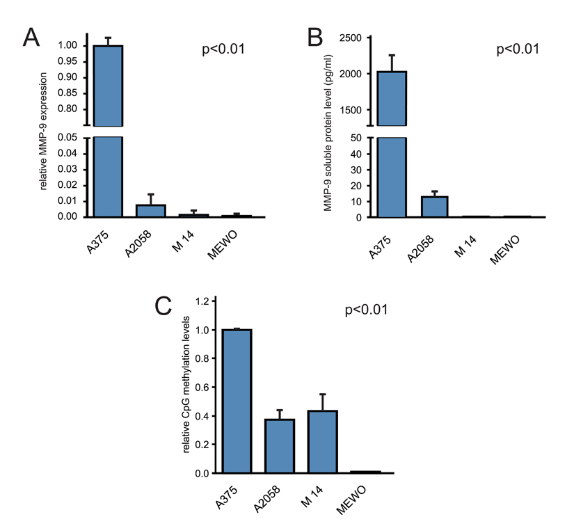 According to these evidences, the analysis of cancer epigenetic modifications is the best approach to discriminate if MMP-9 overexpression is directly associated with tumor progression and not with co-morbidities or inflammatory status. Therefore, in the present study we performed in silico and in vitro analyses to assess the methylation patterns of MMP9 gene in melanoma and its implication in MMP-9 mRNA overexpression [11]. The choice of this tumor type was based on its highly invasive and metastatic characteristics where MMP-9 overexpression may play an important role [3].