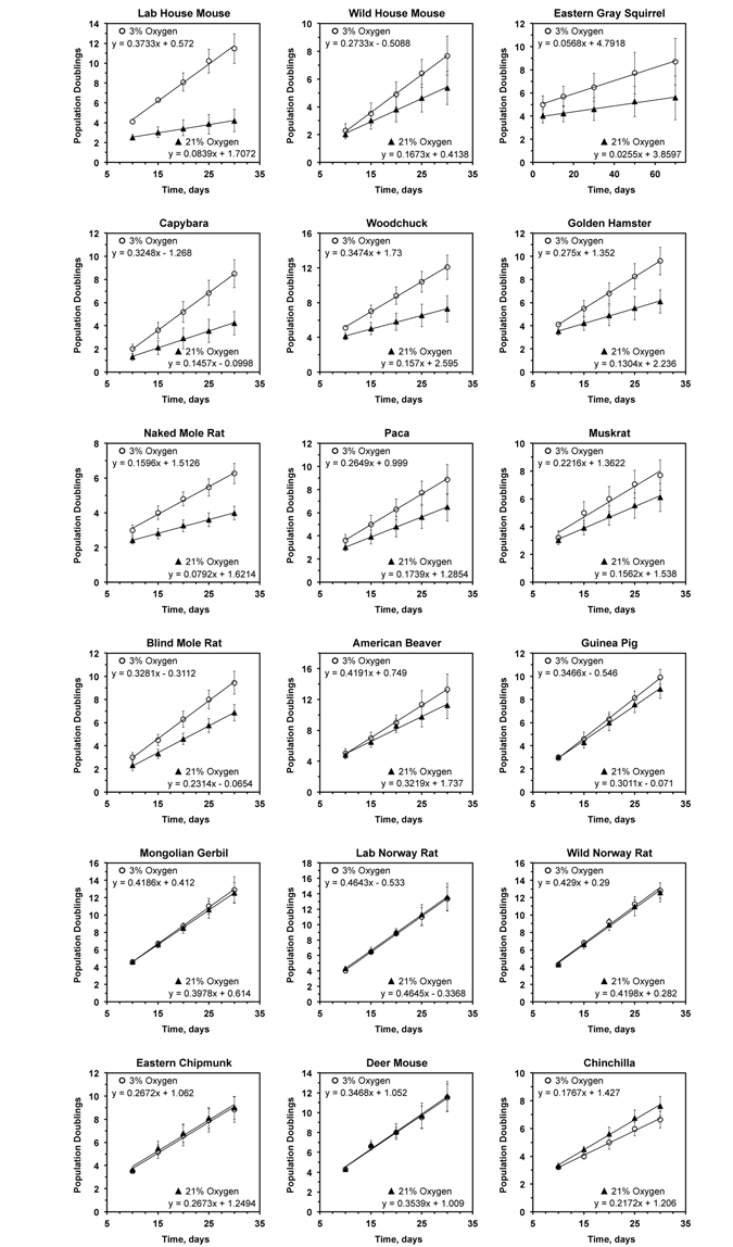 Cells from 9 species, including squirrel, capybara, woodchuck, hamster, naked mole rat, paca, muskrat, blind mole rat, and beaver, showed mild sensitivity to atmospheric oxygen, proliferating between 1.3- and 2-fold faster in 3% oxygen than in 21% oxygen. Cells from 6 species, including guinea pig, gerbil, rat, chipmunk, deer mouse, and chinchilla, showed no difference in proliferation rates between high and low oxygen conditions.