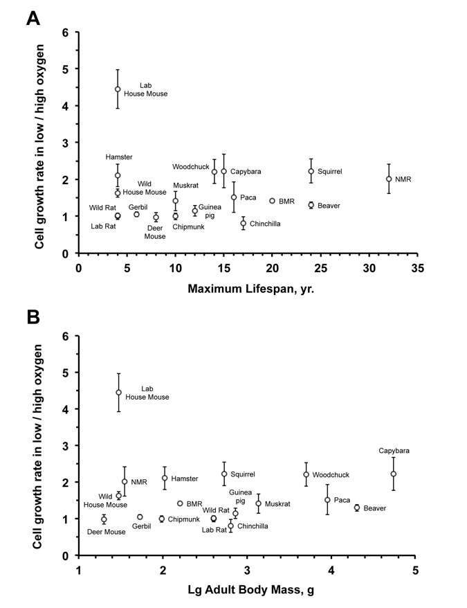 The species in the oxygen non-sensitive group, such as rat, gerbil, and deer mouse, tend to be shorter-lived. These animals may be better equipped than house mouse for counteracting oxidative damage and lack the stringent cell cycle checkpoints, resulting in identical growth rates in high and low oxygen.