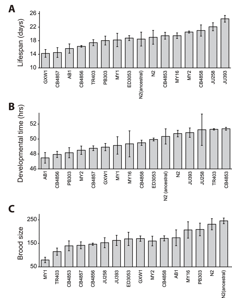 Although our study provides rich information regarding life-history traits of various wild C. elegans strains, a number of limitations still exist. First, a negative correlation between developmental rate and lifespan does not directly infer a trade-off. This is because our current study lacks data supporting a causal relationship for the trade-off. This should be done in future research using molecular genomic and genetic approaches. Second, the number of strains that we examined covers only a small portion of over 200 wild C. elegans strains that have been isolated so far [43]. Third, genetic variations across wild C. elegans strains are relatively low, even among wild isolates that have originated from diverse geographic regions [13, 43-45]. Therefore, it is possible that multiple linked alleles, not a pleiotropic allele, may have affected various traits such as lifespan and development by chance. Fourth, our experimental conditions are likely to be optimized for the fitness of N2, a laboratory reference strain. This may have skewed experimental data for various other wild strains (reviewed in [46]). In fact, our data are consistent with this possibility, because the total progeny number of N2 was the largest among the wild C. elegans strains that we used. It is also possible that laboratory conditions may have selected a highly fecund sub-strain of N2 [47]. Fifth, our experimental setup is far from natural environments that C. elegans strains live in. For example, although we obtained consistent lifespan results with or without FUdR treatment among three selected strains, our lifespan analysis for a majority of strains was performed with FUdR. Additionally, environmental factors such as the presence of pathogens and temperature are different from those of nature. This may have further differentiated our experimental conditions from natural environments. Thus, future research using more natural experimental settings, such as lifespan assays without FUdR, is required. Nevertheless, we believe our study provides valuable information to the field of aging research, because this is one of the first studies that extensively measured correlations among crucial life-history traits in wild C. elegans strains.