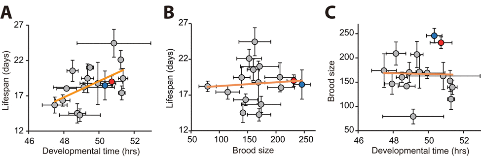 We analyzed correlations among the three parameters of life-history traits: lifespan (in the presence of FUdR), developmental time and brood size. Importantly, we found a significant correlation between lifespan and developmental time (Fig. 2A; r = 0.540, p = 0.031). In contrast, we did not find a significant correlation between lifespan and brood size (Fig. 2B; r = 0.081, p = 0.769). In addition, developmental time did not correlates with brood size (Fig. 2C; r = −0.024, p = 0.934). Together, these data imply that long lifespan correlates with slow development among wild C. elegans strains.