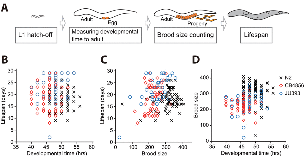 Different genetic backgrounds, or non-genetic heterogeneity such as stochastic effects, may underlie the negative correlation between longevity and developmental rate. Stochastic effects may influence different life-history traits among isogenic populations in almost identical environments (reviewed in [12, 31]). We therefore asked whether a correlation between lifespan and developmental rate exists among individuals of isogenic N2, a standard laboratory C. elegans strain. To determine the entire life-historical traits of individual worms, we measured the developmental time, brood size and lifespan of each N2 worm (Fig. 3A and see Materials and Methods). We did not observe any correlation among lifespan, developmental time, and brood size (Fig. 3B-D and Fig. S3A, D, and G) of N2 individuals; no correlation between lifespan and total brood size is also consistent with the previous report [32].