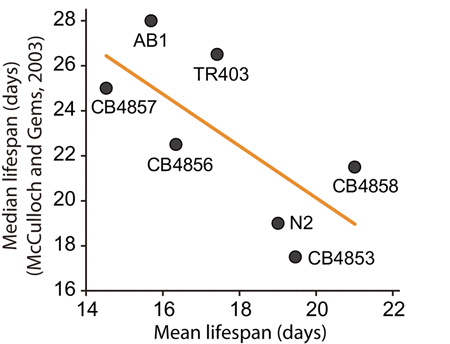 Several studies have previously investigated the relationship among key life-history traits using wild C. elegans strains [22, 34]. McCulloch and Gems showed the absence of correlation between median lifespan and adult body size among 12 wild C. elegans strains. We noted that 7 strains were common between their study and ours, and the tendency of lifespans between these two studies seems different from each other (Fig. 4).