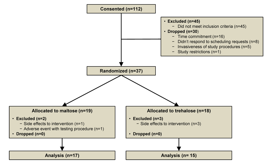 One hundred twelve subjects were consented for the study. Forty-five subjects did not meet inclusion criteria and 30 subjects opted out of the study prior to randomization due to the time commitment (n=16), study restrictions (n=1) and invasive testing procedures (n=5). An additional eight subjects never responded to scheduling requests. Nineteen subjects were assigned to the maltose group and 18 subjects to the trehalose group. Two subjects were excluded from the maltose group due to the development of side effects (n=1) and an adverse event related to a testing procedure (n=1). Three subjects were excluded from the trehalose group due to the development of side effects (Figure 1).